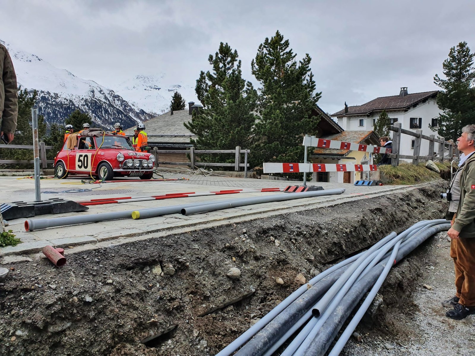 Picture the scene – well, just look at the photos here – when we arrive at the location in Switzerland where the Mini sleeps. And this is what we find: a 2 metres deep hole in the street in front. Somebody forgot about the road works.