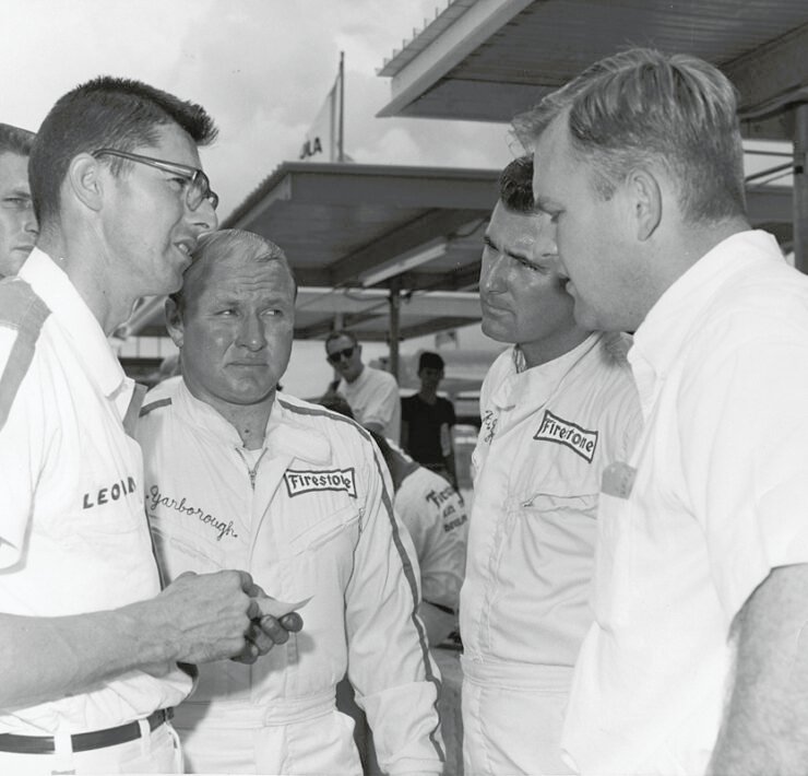 UNKNOWN ? 1968: H. A. ?Humpy? Wheeler (R) Director of Racing with the Firestone Tire & Rubber Company, talks with Leonard Wood (L) of the Wood Brothers NASCAR Cup team as Cup drivers Cale Yarborough (2nd from L) and LeeRoy Yarbrough (2nd from R) listen intently to the conversation. (Photo by ISC Images & Archives via Getty Images)