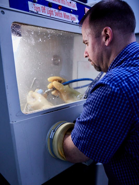 Racecars come with their own unique challenges, chiefly liveries. “Some companies own the rights to everything which allows us to use the whole design. But then it’s limited by our production budget and how many colours we can do. We’re running the production line so fast we can’t apply them as decals. We either do a tampography rubber stamp or a more detailed laser print.