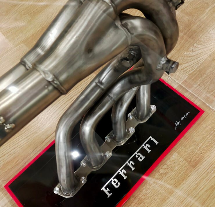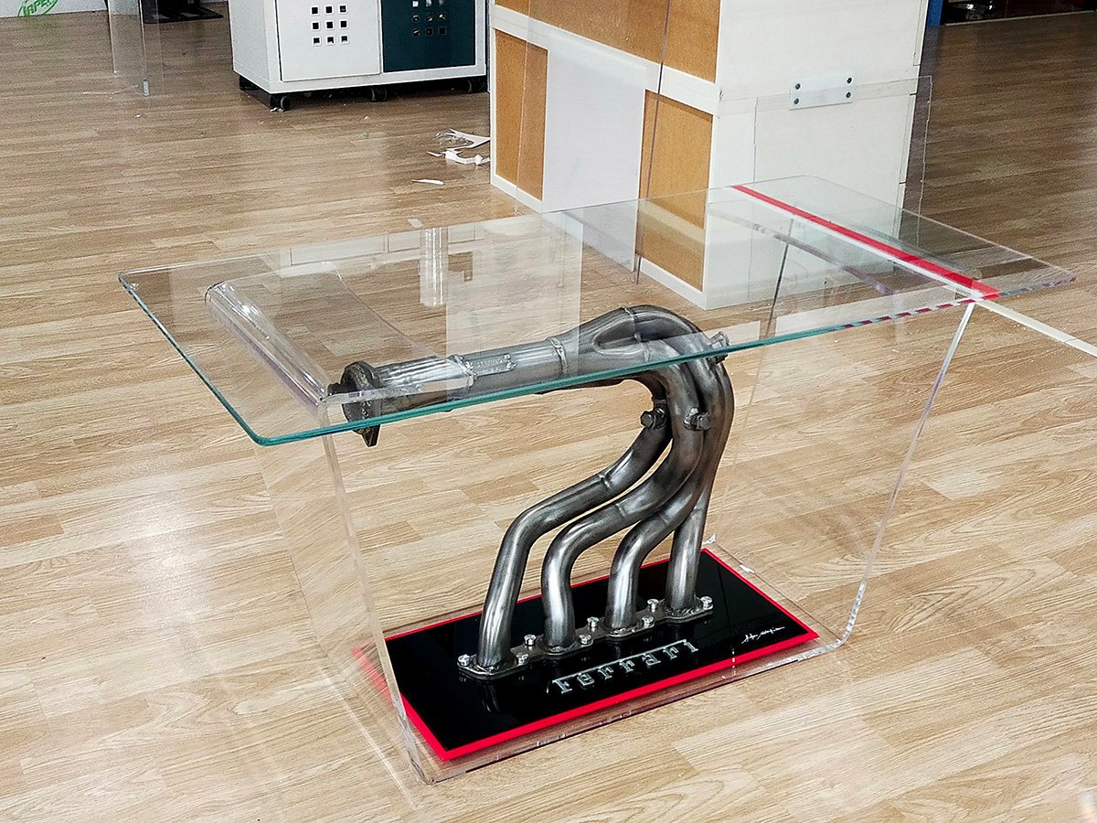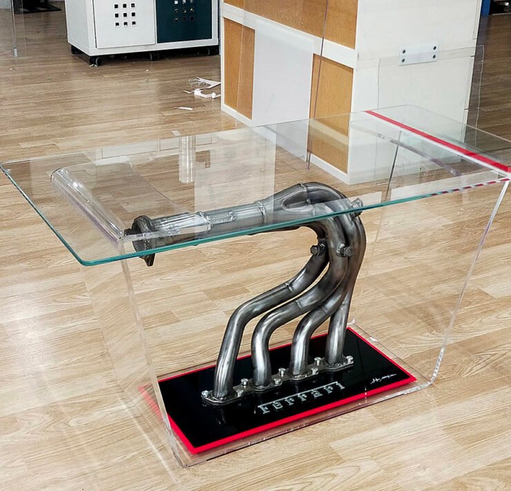 Added to that is the Ferrari script on the methacrylate base, also taken from a production car at the end of its life. The glass surface of the table measures 50×70 centimetre. Notargiacomo will produce it on special order. Expect a price tag of around €4200 ($4330).