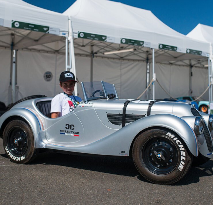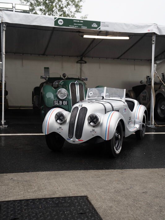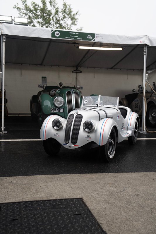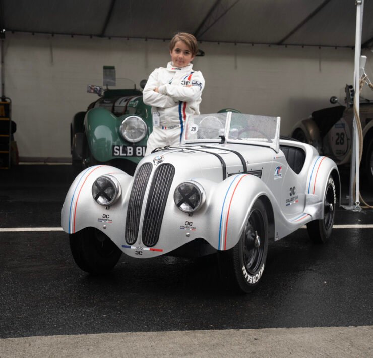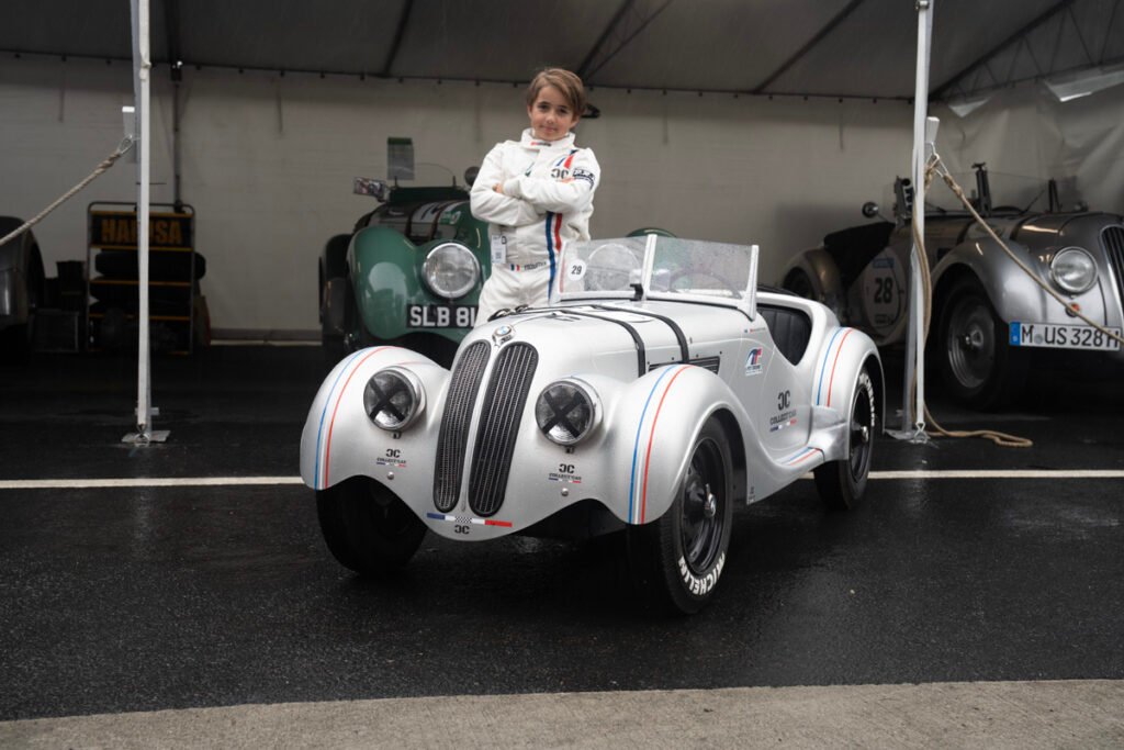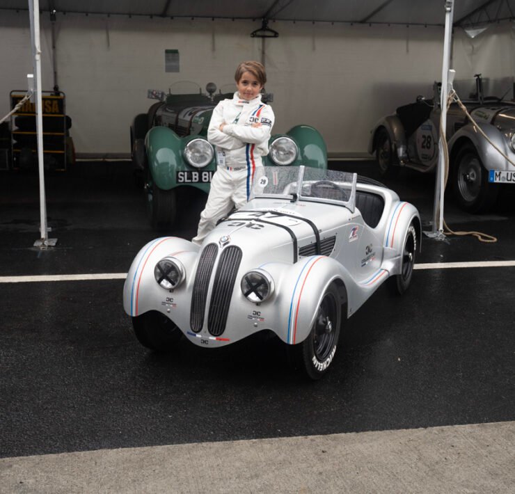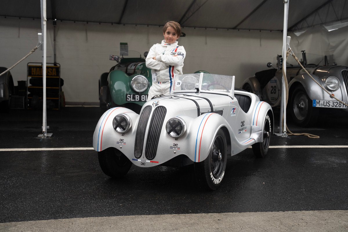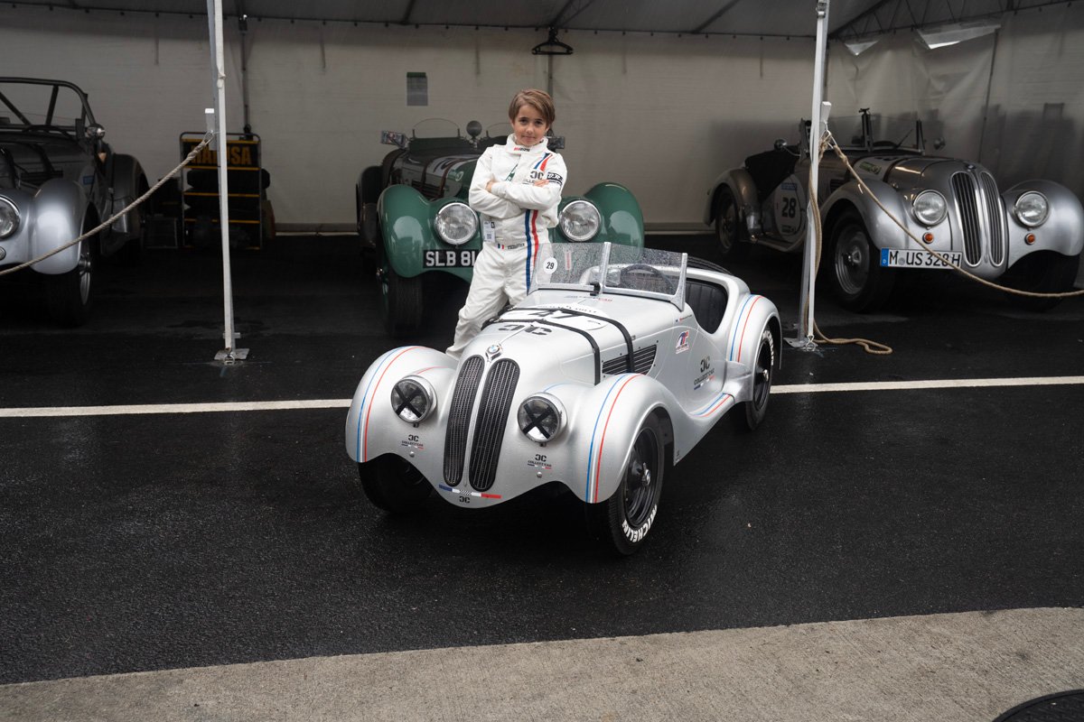 Leo is cool as McQueen in his race suit, posing alongside the real article, the BMW 328 Brian Rivett and Andy Prill are sharing in this year’s Le Mans Classic. He’s not the least bit impressed, zooming through Paddock 1 behind the pits on his way to the photoshoot. It’s a sight to behold, that little 328 dashing through a paddock full of Bugattis, Alfa Romeos, and of course, BMW 328s.