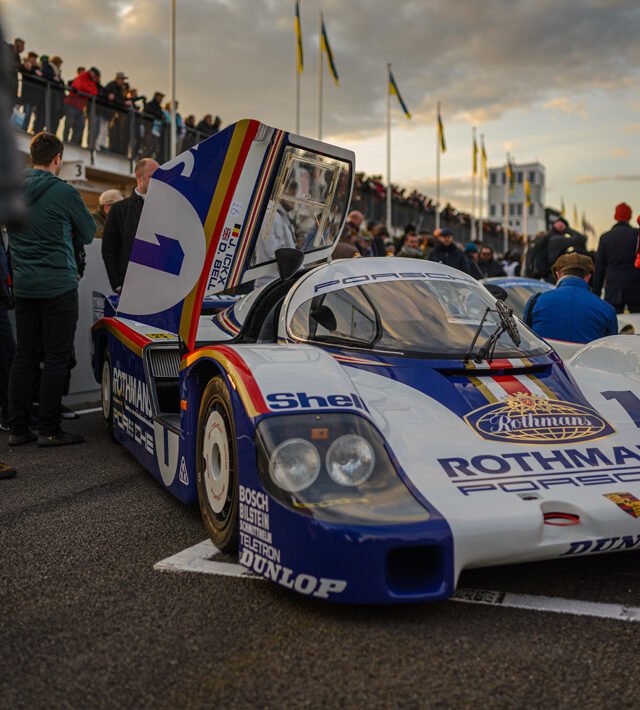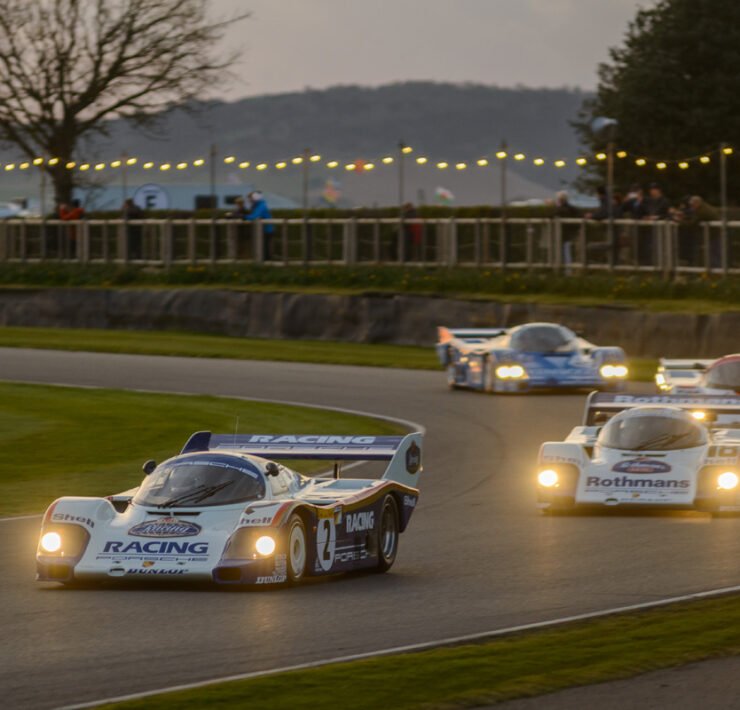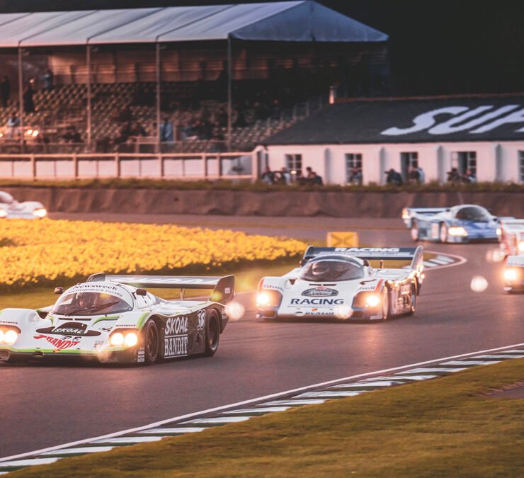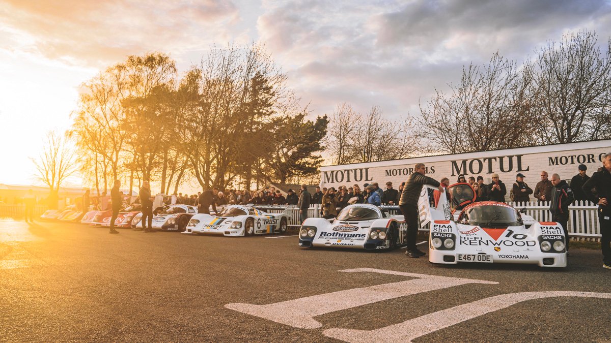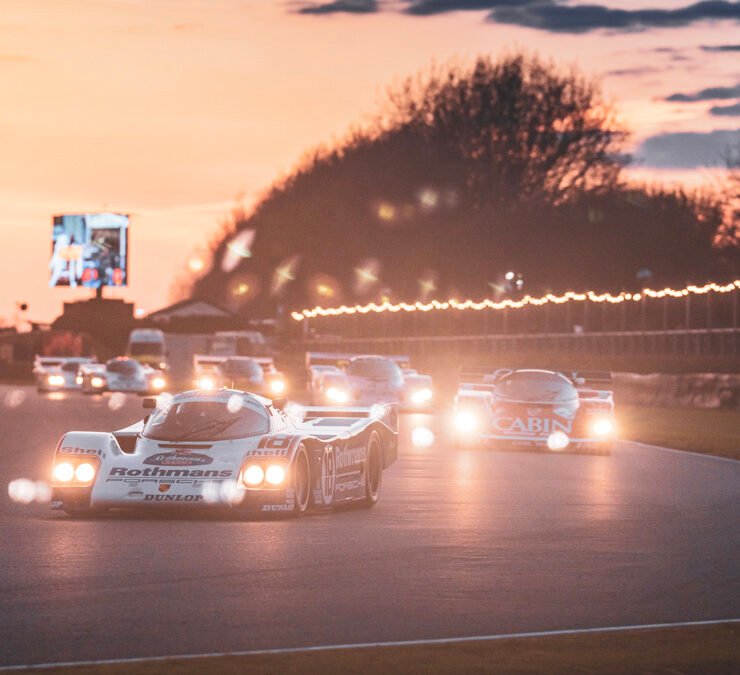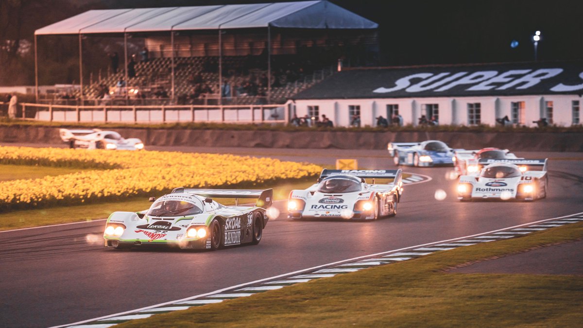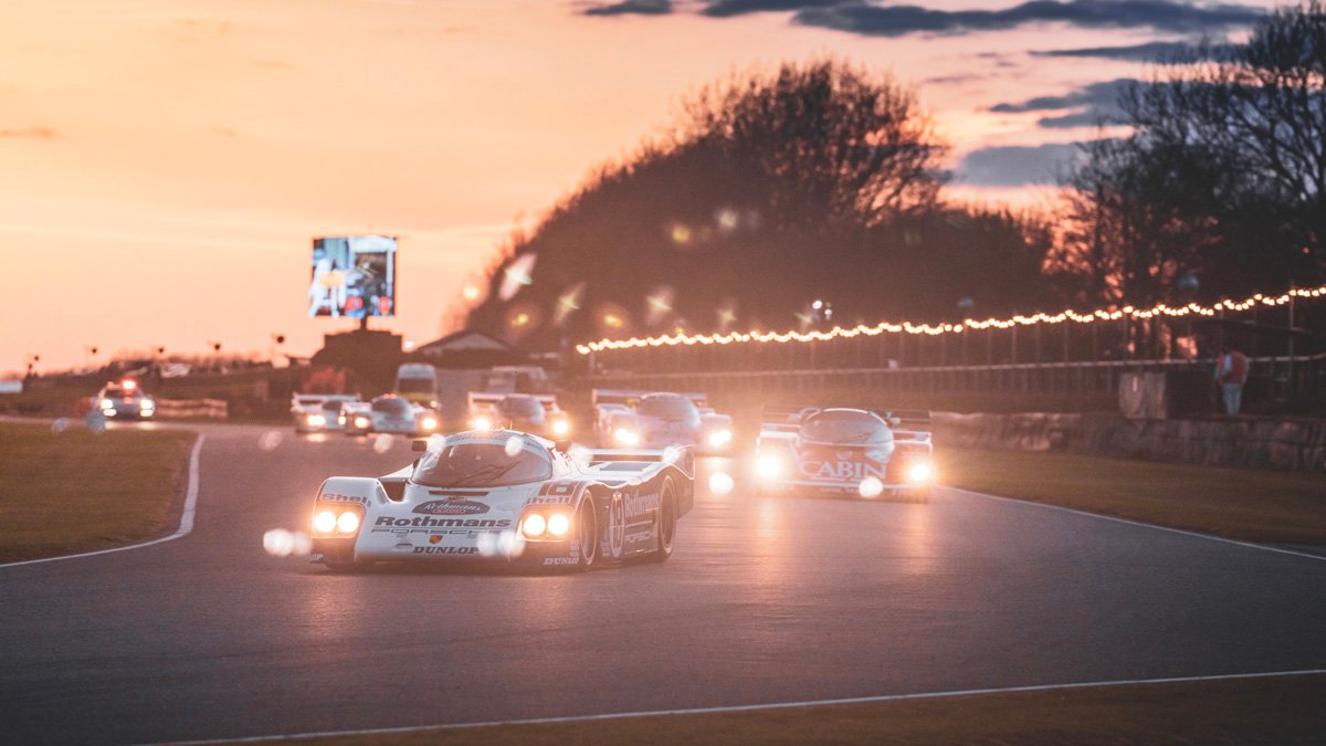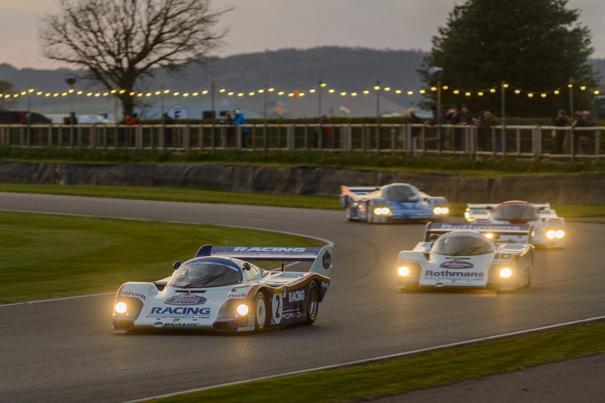 The parade of Porsche 956s and 962s, headlights piercing through the beginnings of night, was one of the highlights of Goodwood’s 79th Members’ Meeting. A magical moment.