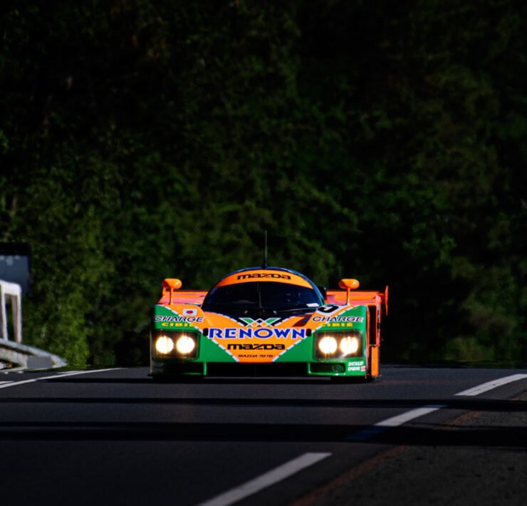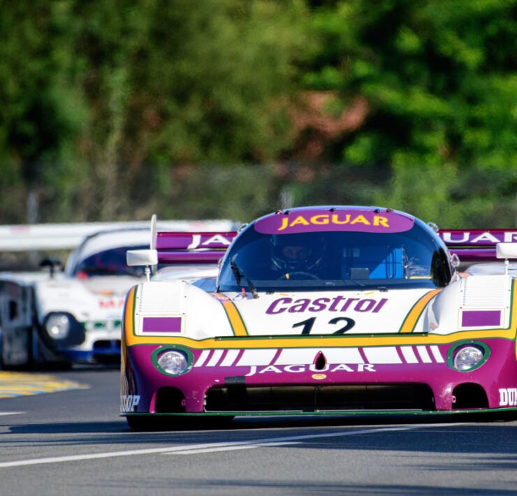 Now the sun has set over the grandstands, we are watching a set of lights appear. They flick through the fast Porsche curves. The six-cylinder pushes out a big fat roar and the Jaguar D-Type heaves into full view. It flashes by, then the engine pops as the driver takes his foot off the throttle and brakes for the Ford chicane. He blips, and comes down one gear, then another one. As he enters the start/finish straight, the floodlights around the grandstand give him a brief moment of clear vision before he plunges into the darkness again, gone for another lap around the 8.5 mile-long epic Le Mans circuit.