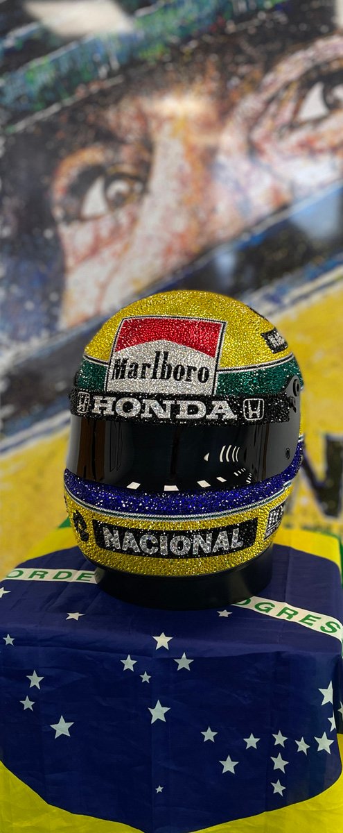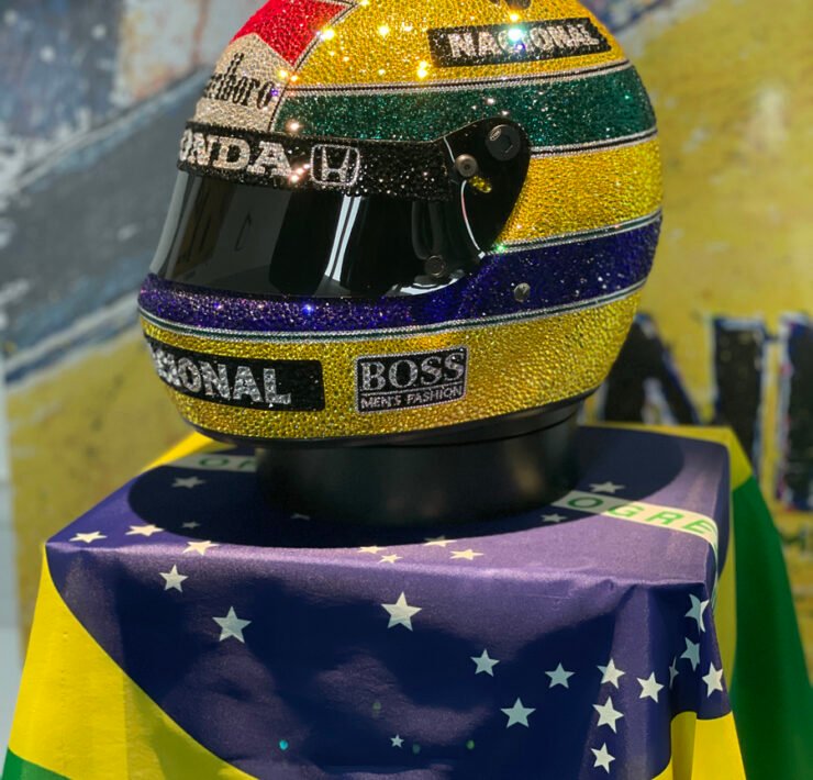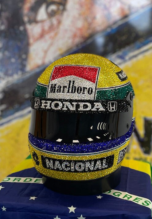 The Ayrton Senna Crystal Helmet by Stokesi is a creation artist Tracy Stokes produced. Based around a helmet, Tracy Stokes worked with 49,104 Swarovski crystals to produce this exact replica of the helmet Ayrton Senna wore in the 1988 Japanese Grand Prix at Suzuka. This is where Senna won his first of three world championship titles.