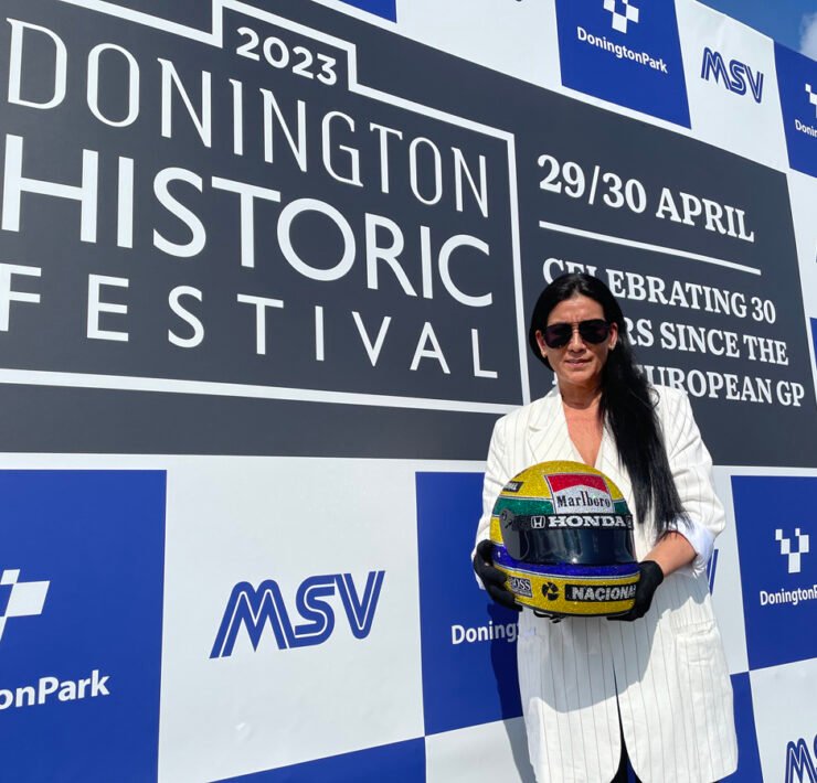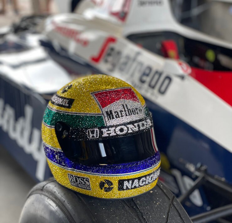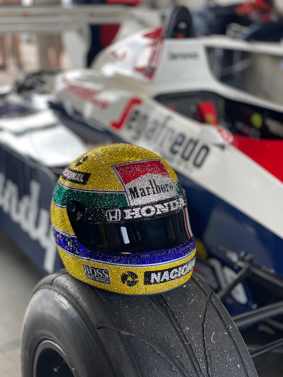 The Donington Historic Festival was the first opportunity for the public to see the replica of Ayrton Senna’s iconic helmet, reproduced with 49,104 Swarovski crystals.
