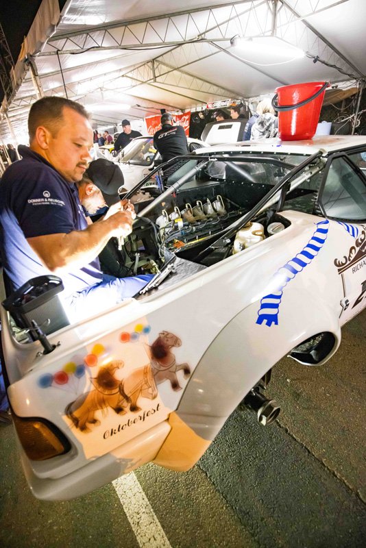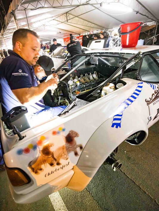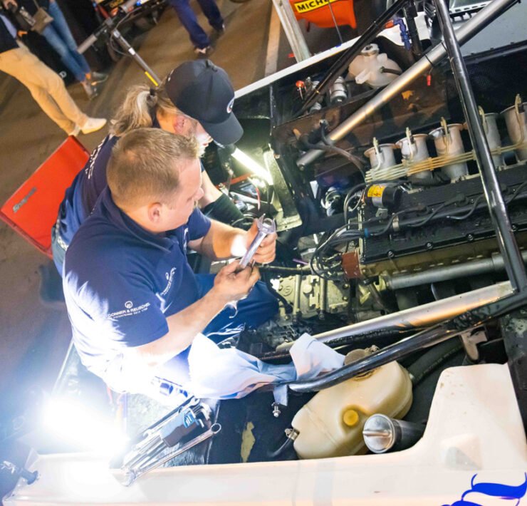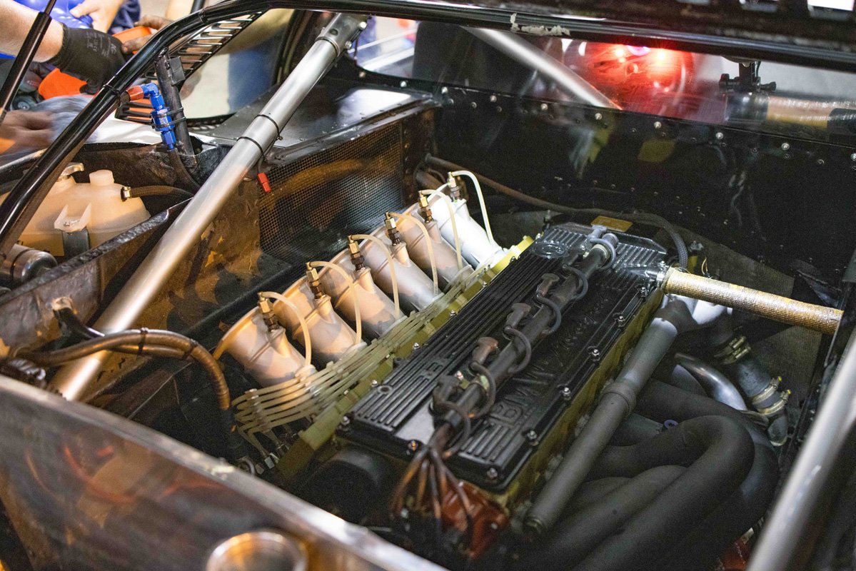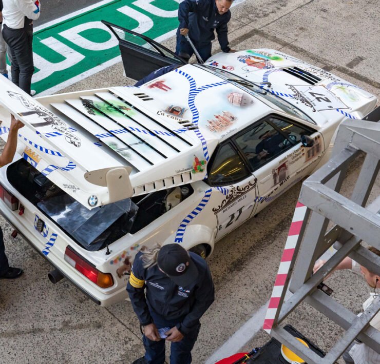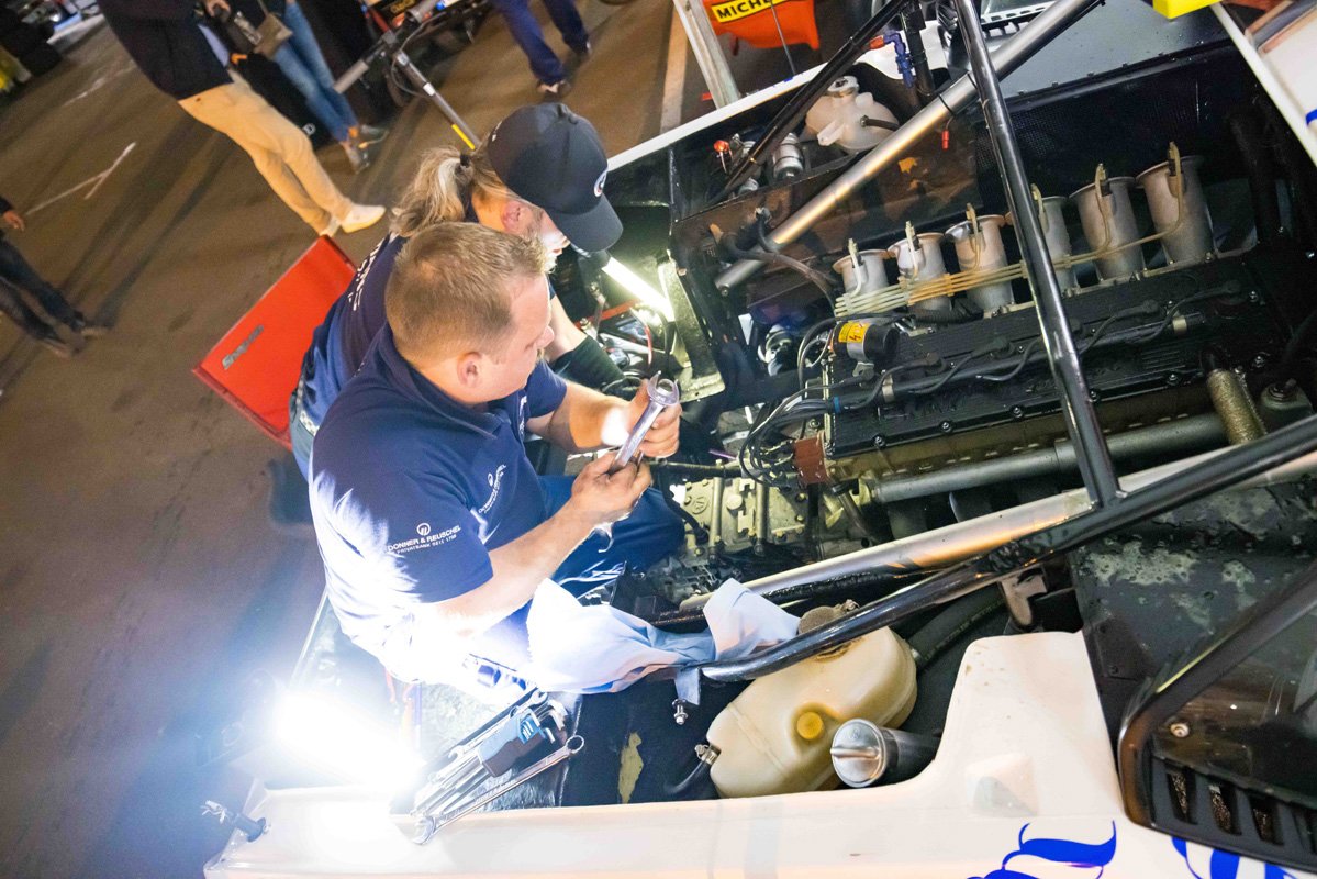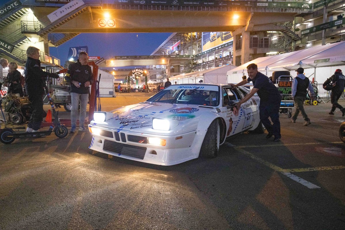 Seeing the impressive hole in the engine block, you would assume that would be the end of the weekend. But not so for the crew of BMW Group Classic. Under nothing more than a tent in the paddock behind the pits, they went to work and swapped the engine. Come Saturday morning, Christian Danner was able to go out again. Le Mans, it really is something else altogether.